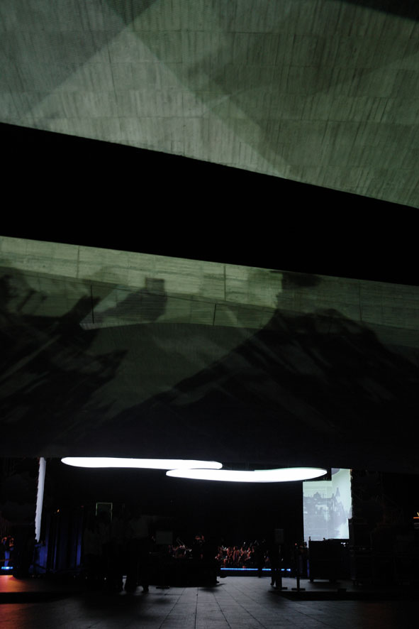 The production was planned for full orchestra (83 musicians on stage), a women’s and a children chorus (approx. 400 singers), one soloist singer and for 72 timbals which were positioned in a circle on the buildings ramps, bridges and the surrounding area embracing the audience.